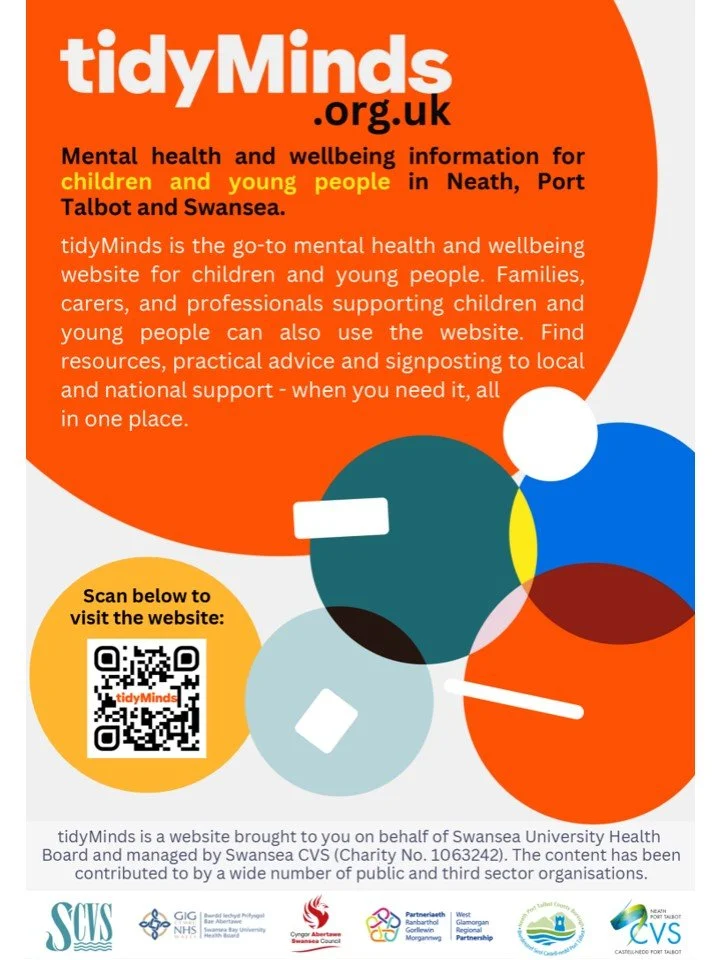 Click on this link: tidyMinds.org.uk, for an extremely useful website designed to help and support young people living in Swansea or Neath Port Talbot with their mental health. There is also an area on the website giving advice to parents.
